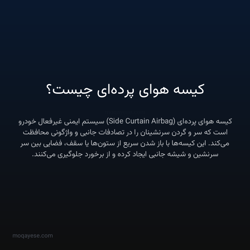 کیسه هوای پردهای، که به عنوان کیسه هوای جانبی پردهای (Side Curtain Airbag) نیز شناخته میشود، یکی از پیشرفتهترین سیستمهای ایمنی غیرفعال در وسایل نقلیه موتوری است که برای محافظت از سر و گردن سرنشینان در برابر ضربات جانبی و حین واژگونی طراحی شده است. این سیستم شامل کیسههای پارچهای انعطافپذیر و بادوام است که در زمان وقوع تصادف، به سرعت از قسمت بالا و کناری خودرو (معمولاً از سقف یا ستونهای A، B و C) باز شده و فضایی محافظ بین سر سرنشین و شیشه جانبی خودرو ایجاد میکنند. هدف اصلی این کیسهها، جلوگیری از برخورد سر سرنشینان با اجزای سخت داخلی خودرو مانند ستونها، درها و شیشهها، و همچنین کاهش خطر آسیبهای ناشی از خروج از پنجره در هنگام واژگونی است.