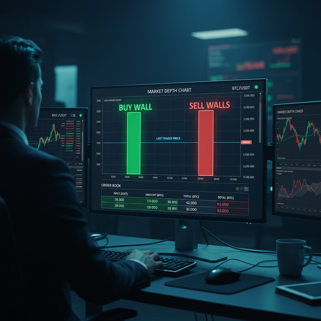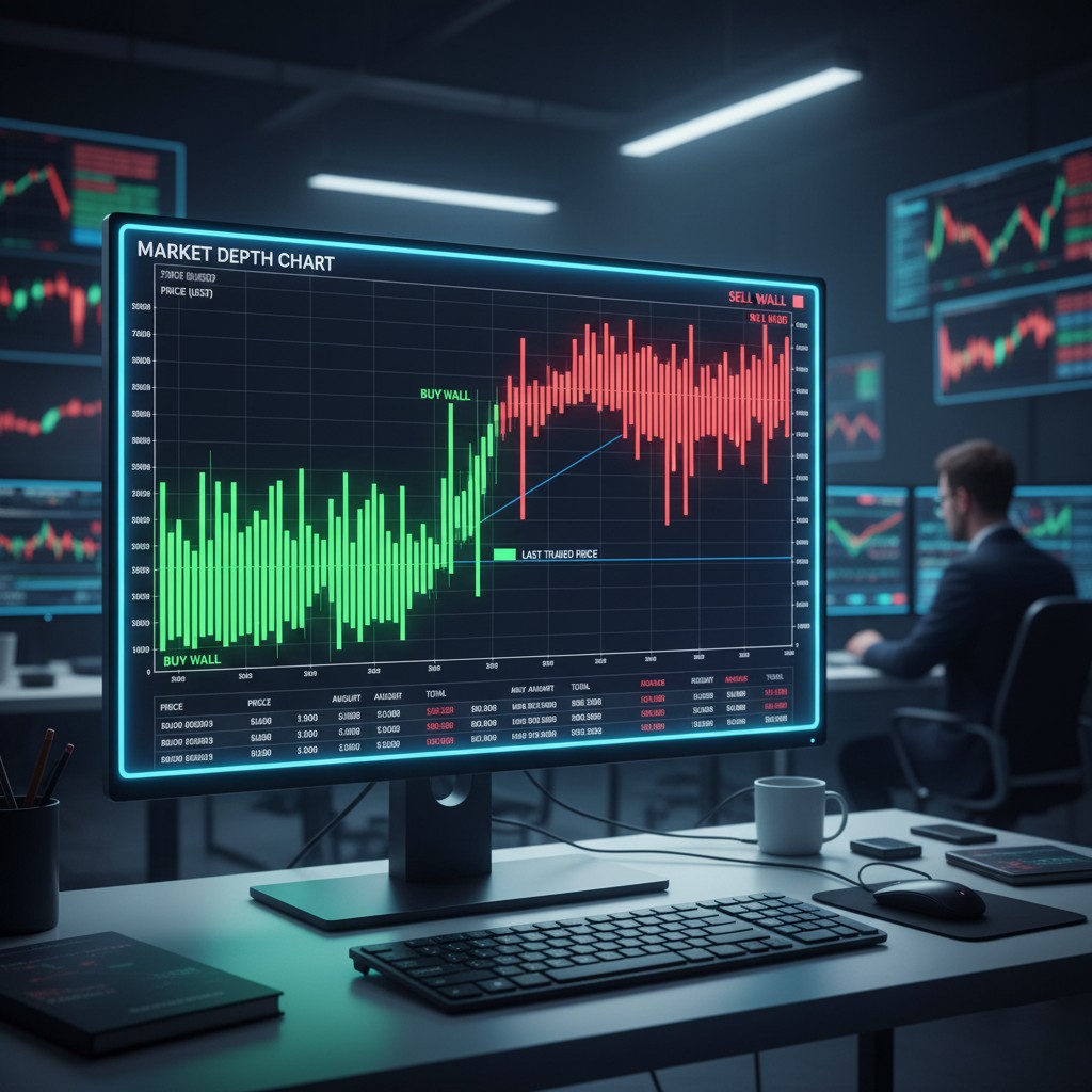 معاملهگران حرفهای با تحلیل نمودار عمق بازار (Depth Chart)، که نمایش بصری دفتر سفارشات است، میتوانند سطوح حمایت و مقاومت کلیدی را شناسایی کنند. دیوارهای بزرگ خرید (Buy Walls) و دیوارهای فروش (Sell Walls) که در ادامه به آنها میپردازیم، به وضوح در این نمودارها قابل مشاهدهاند.