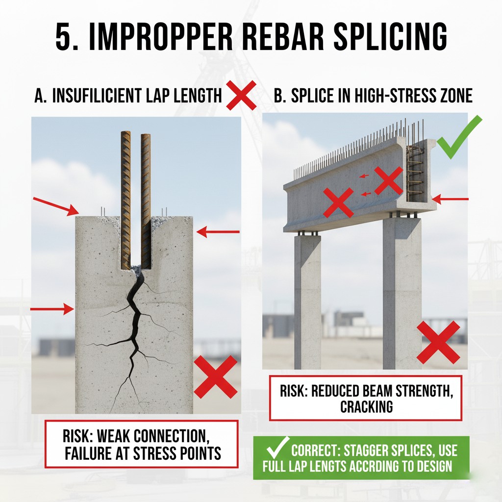 ۵. اشتباه در نحوه اتصال و وصله میلگردها (Splicing)