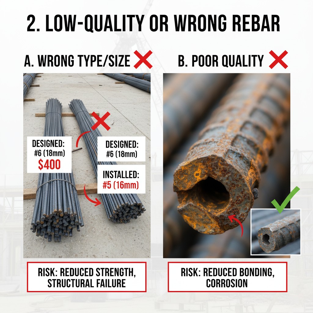 استفاده از میلگرد با سایز کوچکتر: یکی از روشهای غیراخلاقی برای کاهش هزینه، استفاده از میلگرد با قطر کمتر از آنچه در نقشه مشخص شده است (مثلاً استفاده از میلگرد ۱۶ به جای ۱۸). از آنجایی که مقاومت کششی با مجذور قطر میلگرد رابطه مستقیم دارد، این کاهش به ظاهر کوچک، ظرفیت باربری عضو را به شدت کاهش میدهد.