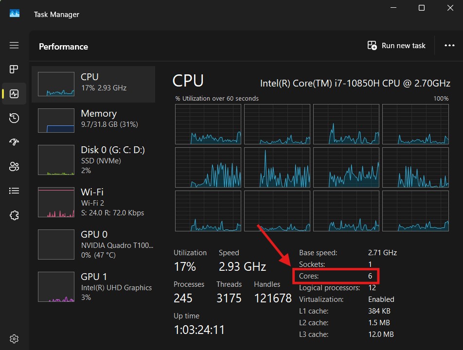 میتوانید به صورت دستی وارد Task manager کامپیوتر شوید؛ به تب Performance مراجعه کنید و در قسمت CPU بررسی کنید که دستگاه شما چند هسته (Core) دارد.