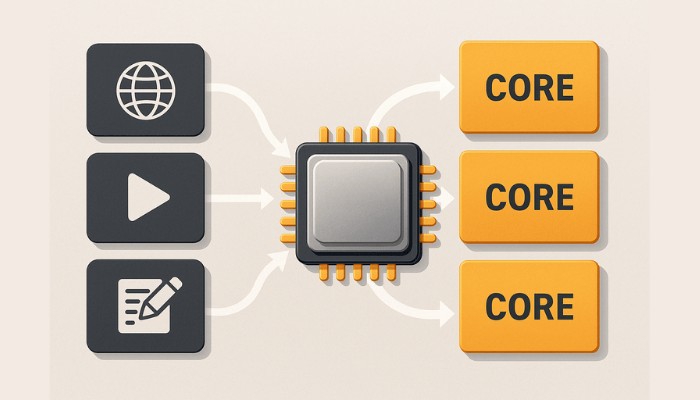 همانطور که قبلاً گفتیم، در پردازندههای چند هستهای، هر هسته بهطور مستقل عمل میکند. سیستمعامل و برنامهها وظایف (یا رشتههای کاری) را بین این هستهها تقسیم میکنند تا بهصورت موازی اجرا شوند.